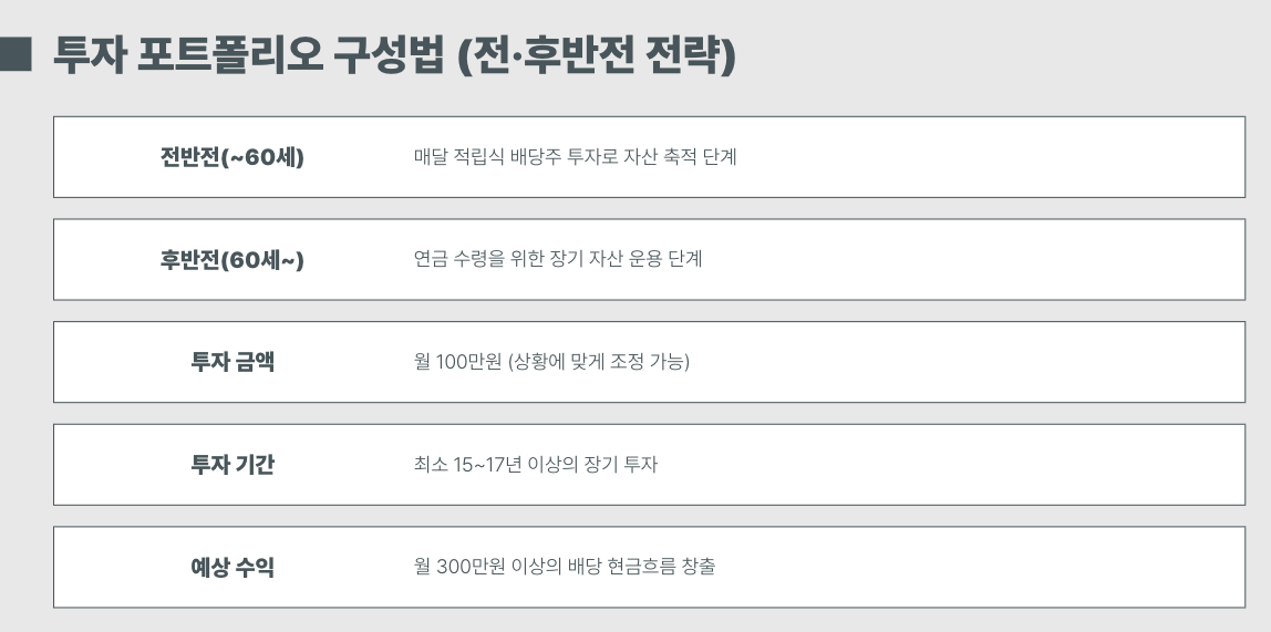 | 전반전 | 소득 발생 시기 (~60세) | 매달 적립식 배당주 투자 | 미국 배당주 직접 or ETF |