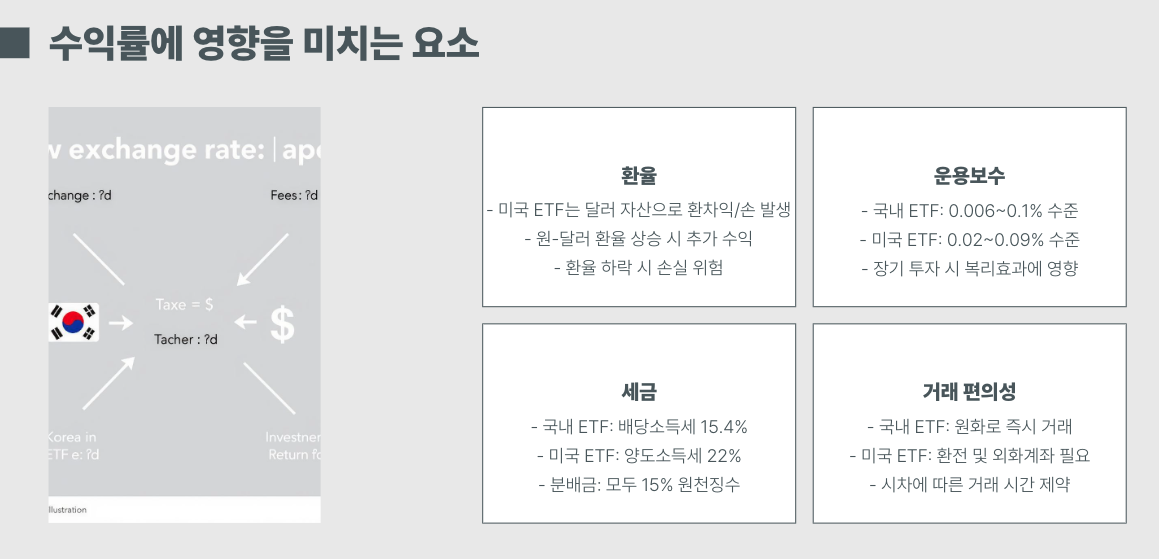 ETF 수익률은 단순히 주가 상승뿐 아니라 환율, 보수, 세금이 복합적으로 작용합니다.