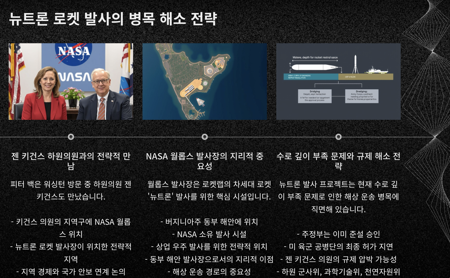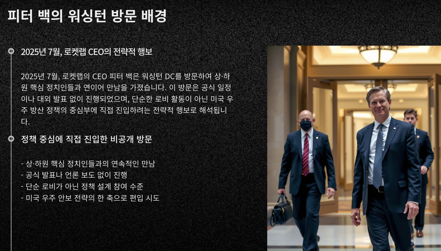미국 워싱턴 DC에서는 일반 대중이 눈치채지 못할 조용한 움직임이 있었습니다. 로켓랩(Rocket Lab)의 CEO 피터 백(Peter Beck)이 워싱턴을 방문해 상·하원 핵심 정치인들을 잇달아 만났습니다. 공식 일정도, 대외 발표도 없었지만, 이 방문은 단순한 로비가 아닌 정책 중심에 직접 진입한 사건으로 해석되고 있습니다.