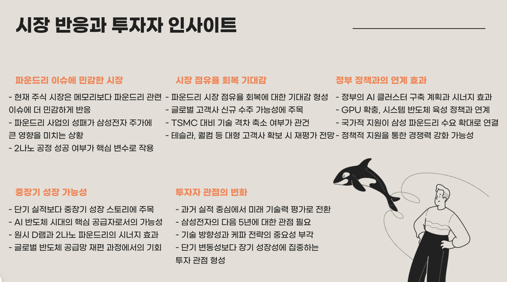또한, 정부의 AI 클러스터, GPU 확충, 시스템 반도체 육성 정책이 삼성 파운드리 수요와 직결될 수 있어, 중장기 성장 가능성에 대한 신뢰를 회복할 수 있는 기회입니다.