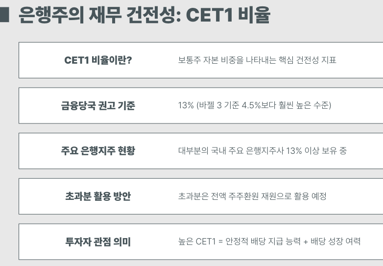 은행주의 재무 건전성을 나타내는 지표 중 하나가 CET1 비율입니다. 이는 보통주 자본 비중을 나타내며, 높을수록 배당 여력과 안정성이 높습니다.