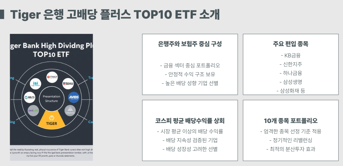 Tiger 은행 고배당 플러스 TOP10 ETF는 특히 은행주와 보험주 중심으로 구성되어 있어 다음과 같은 특징을 가집니다.