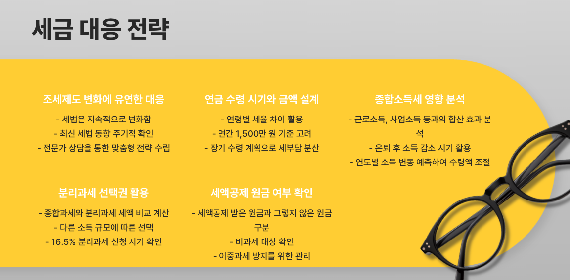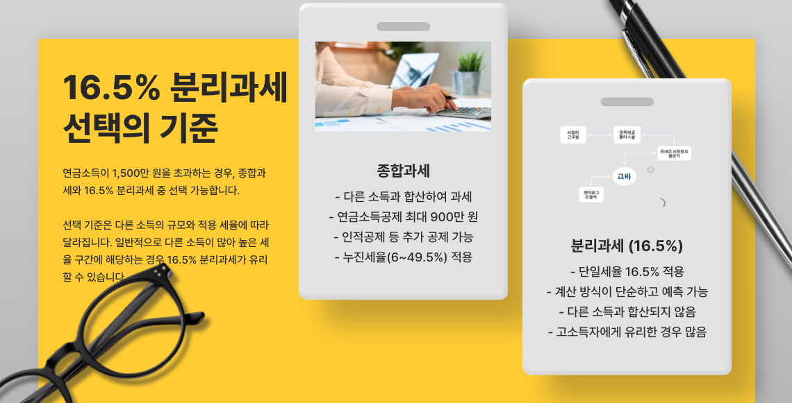 나의 소득 구조, 세금 공제 가능성, 수령 계획을 종합적으로 고려해 유리한 방식으로 세금을 선택하는 것이 핵심입니다.