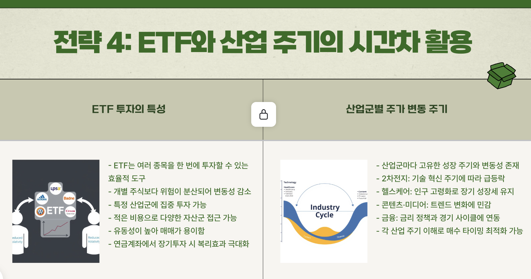 ETF에 투자하는 경우, 한 산업군(예: 2차전지, 헬스케어, 콘텐츠 등)의 주가는 짧게는 수개월, 길게는 수년 간 부침을 겪습니다.