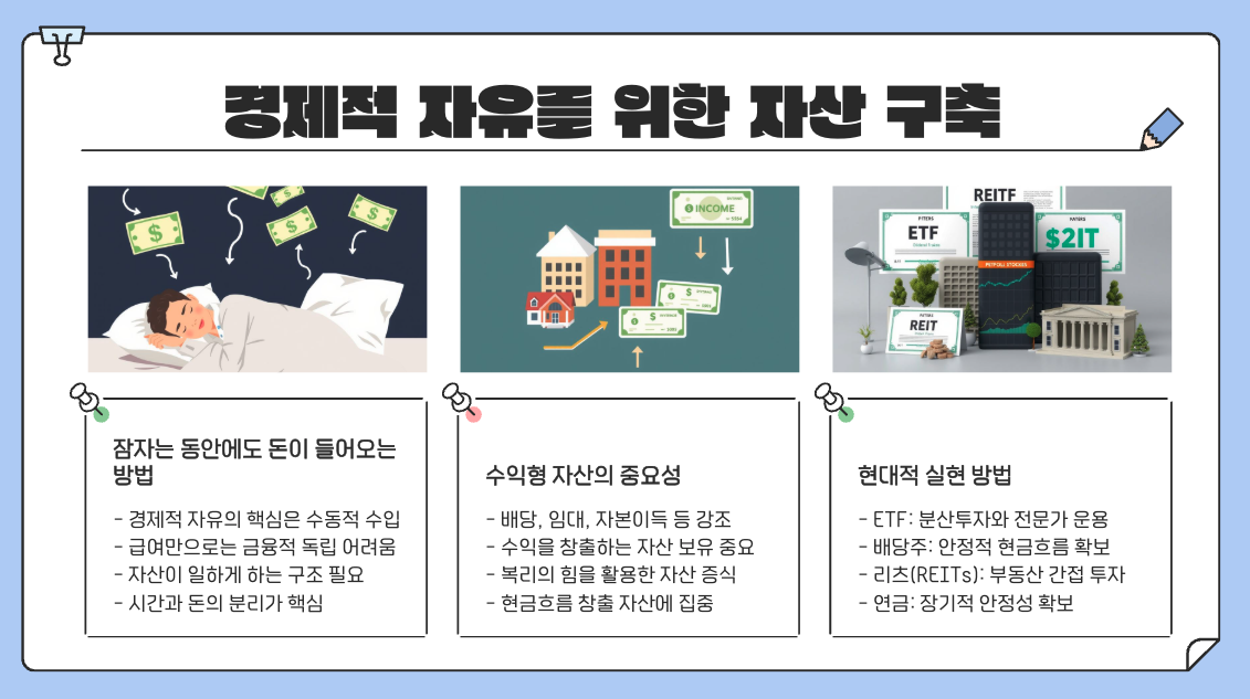 오늘날 우리는 이를 ETF, 배당주, 리츠(REITs), 연금 등으로 실현할 수 있습니다.