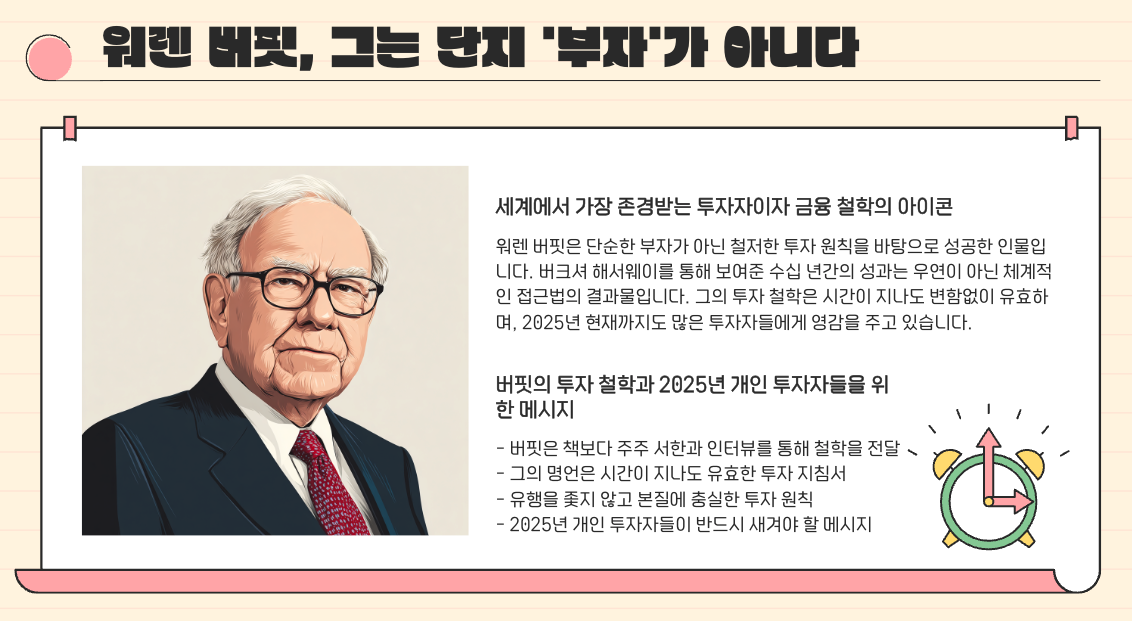 버핏은 천재지만, 그의 투자 철학은 누구나 실천할 수 있는 원칙 중심입니다.