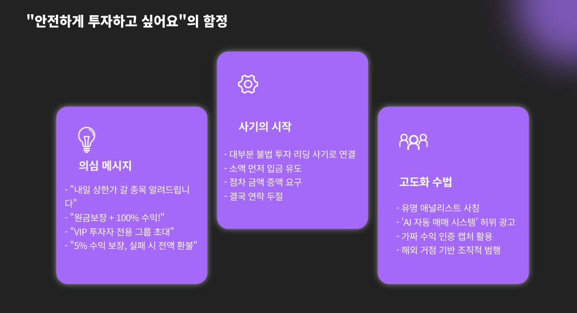 심지어, 유명 애널리스트 사칭이나 ‘AI 자동 매매 시스템’을 내세우며 투자자들을 속이는 고도화된 수법도 존재합니다.