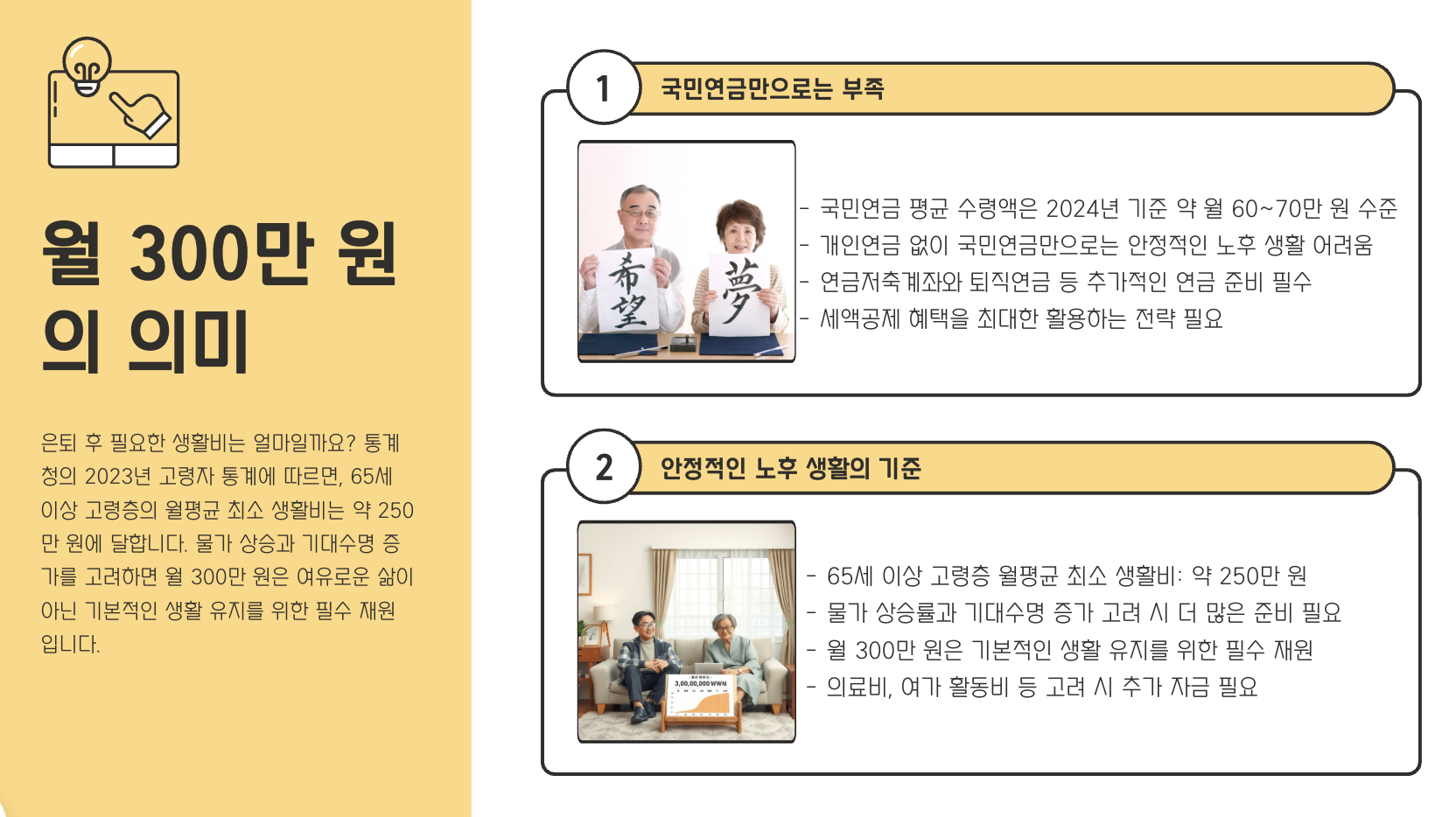 - 개인연금 또는 퇴직연금 포함 시, 현실적으로 월 300만 원 달성 가능