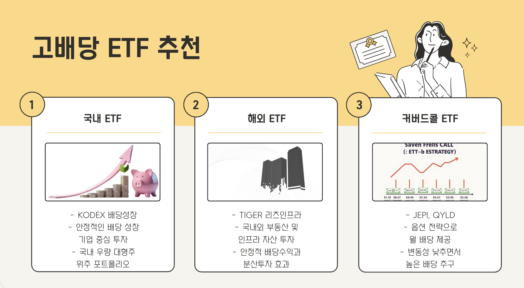 고배당 ETF 추천: KODEX 배당성장, TIGER 리츠인프라, JEPI, QYLD