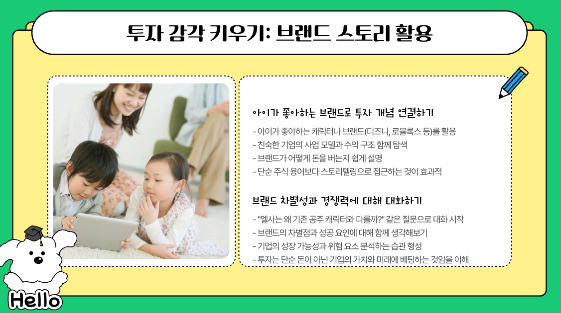예를 들어, 아이가 ‘겨울왕국’ 캐릭터를 좋아한다면 디즈니 주식, ‘로블록스’를 자주 한다면 로블록스 기업의 수익 모델을 함께 분석하는 방식입니다.