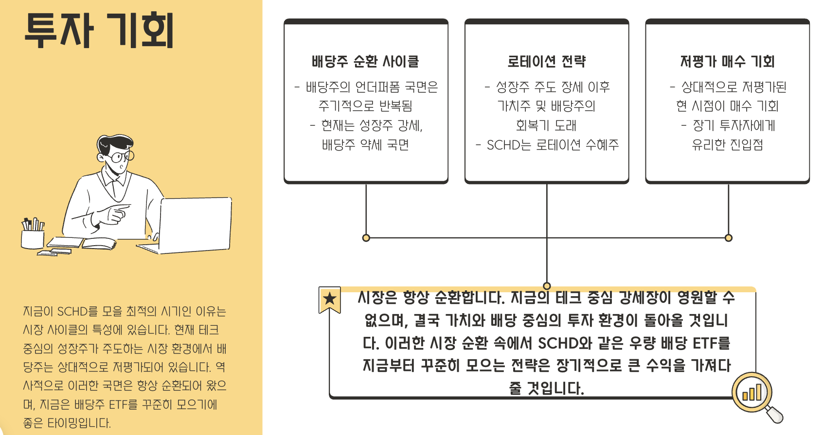 이로 인해 SCHD 보유자들 사이에서 “이대로 괜찮은가?”라는 고민이 나오고 있지만, 투자 국면은 항상 순환된다는 점에서 오히려 현재는 정립식 매수와 분할 매수에 적합한 타이밍으로 평가됩니다.