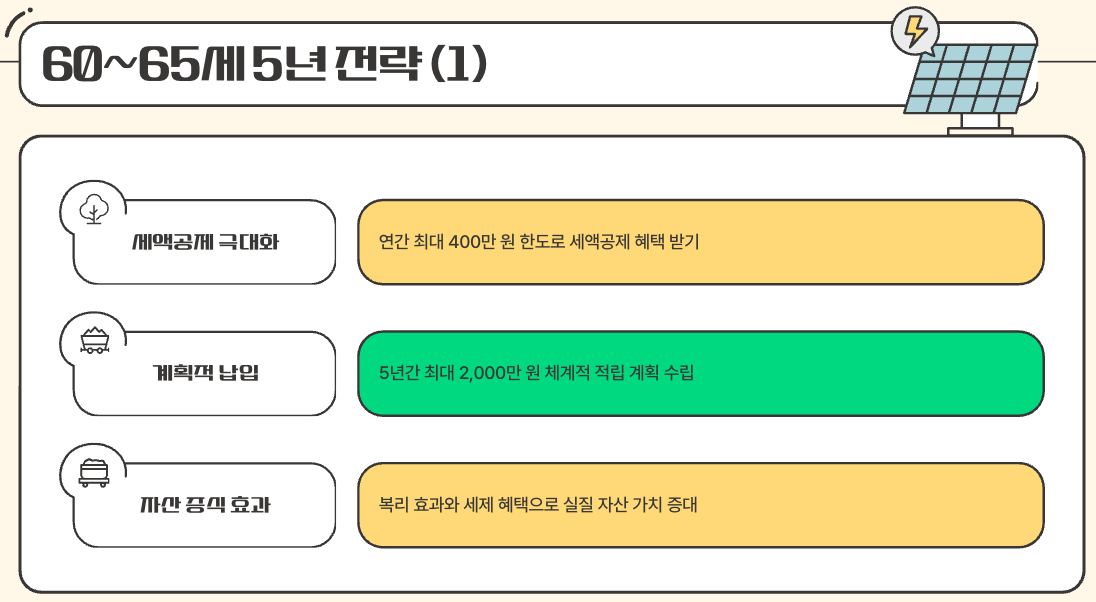 - 5년 이상 납입 시 연금 수령 가능 → 65세 이후 안정적 현금 흐름 확보