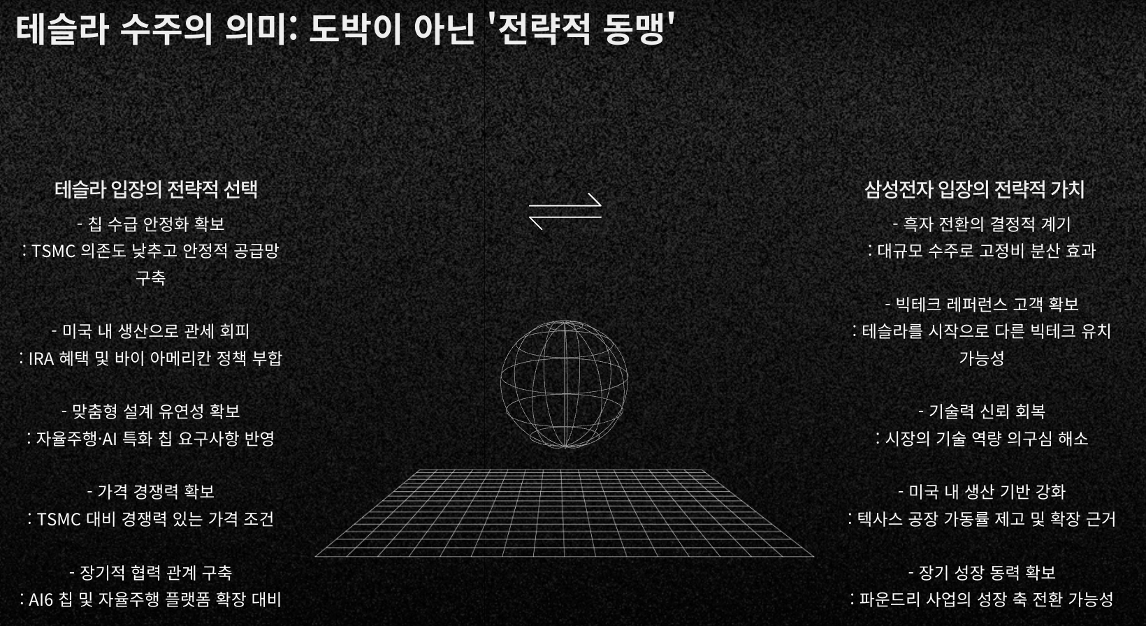 - 테슬라 입장: 칩 수급 안정 + 미국 내 관세 회피 + 전략적 협업 강화