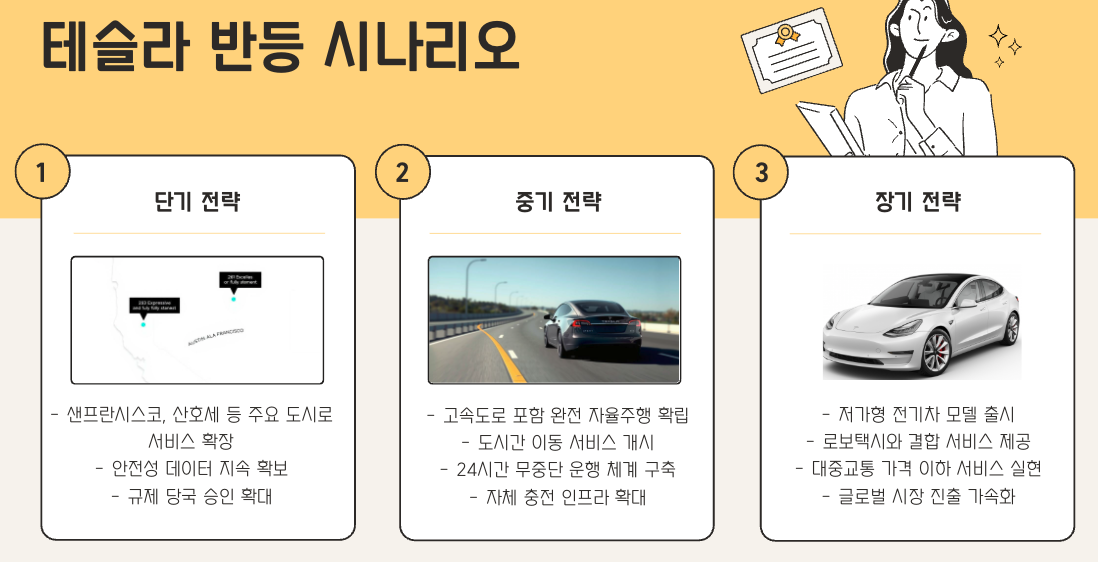 - 장기: 저가 전기차 + 로보택시 결합, 대중교통 가격 이하 서비스 제공