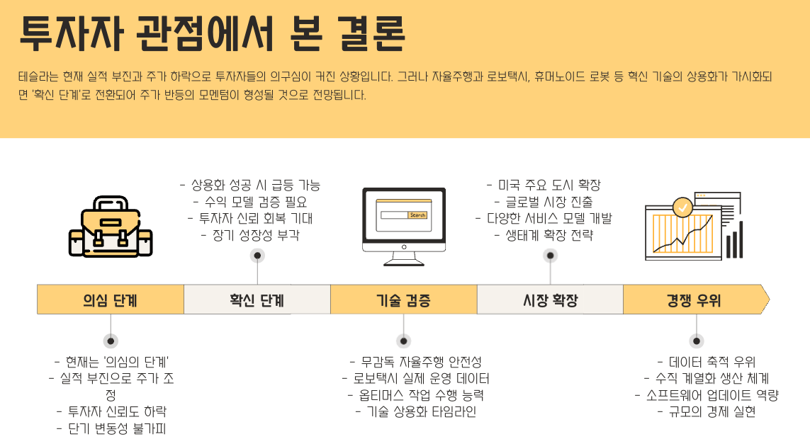 특히 무감독 자율주행, 로보택시 상용화, 휴머노이드 로봇(옵티머스) 개발이 본격화되는 올해는 향후 주가 반등의 발판이 될 가능성이 큽니다.