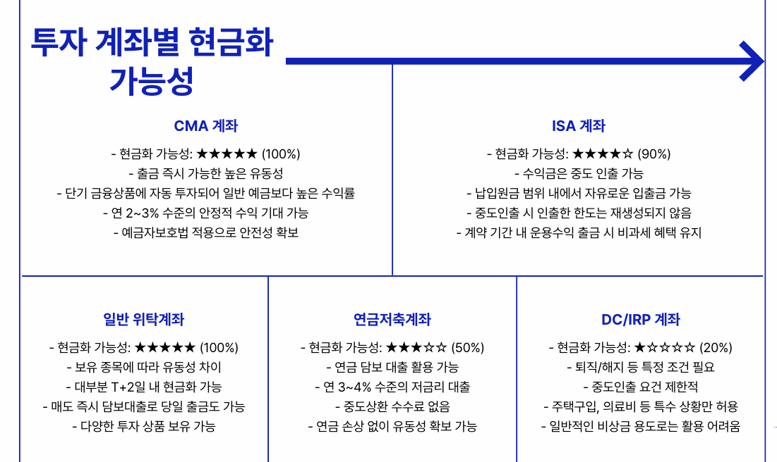 증권 투자에 있어 자산은 대부분 유동성이 확보되어 있습니다. 아래는 대표적인 투자 계좌들의 황금성(현금화 가능성) 평가입니다.