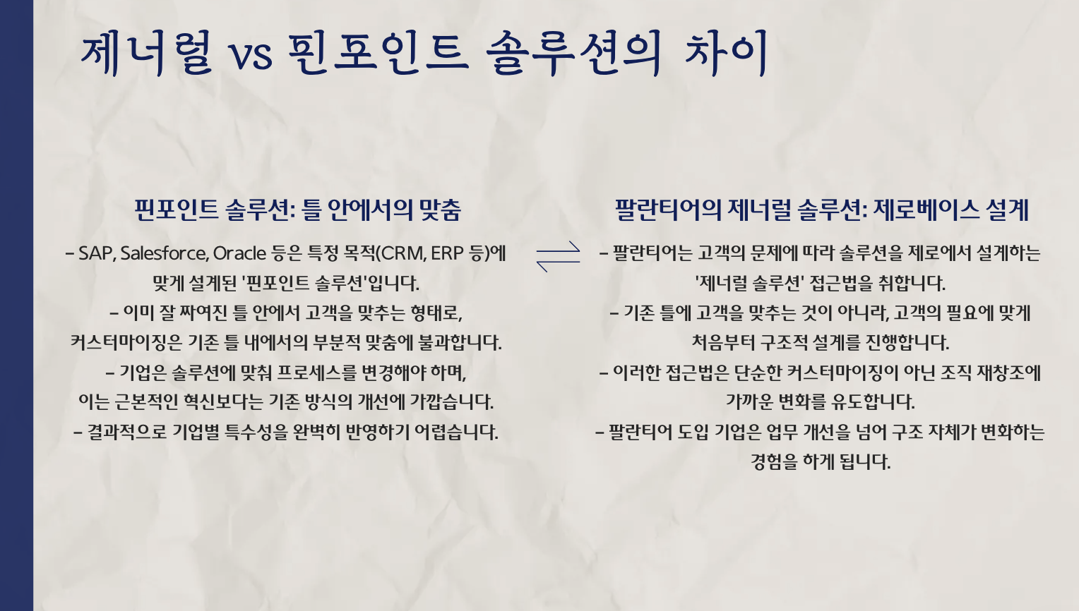 가장 중요한 차별점은, 문제 중심으로 솔루션을 구축하고 고객 조직 자체를 재구성하는 데 초점을 둔다는 점입니다.
