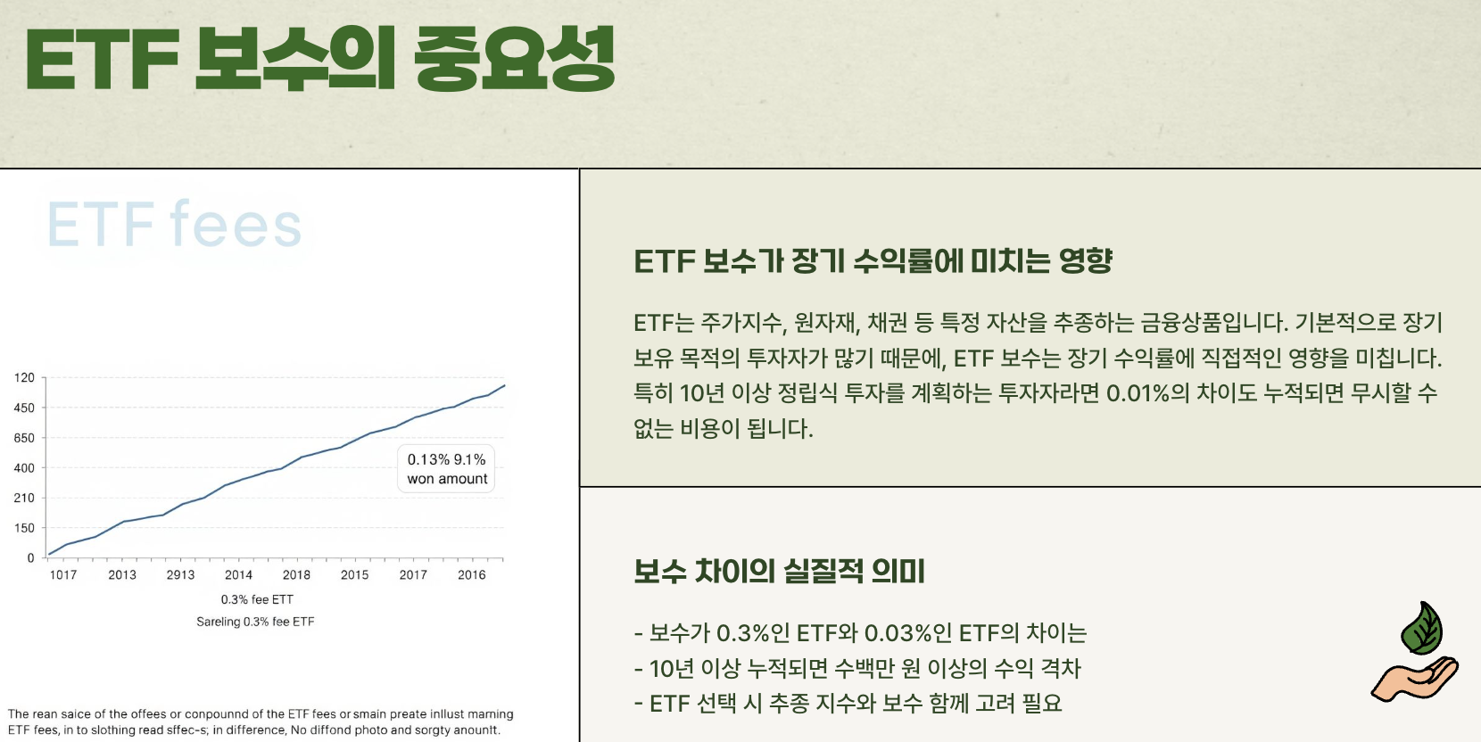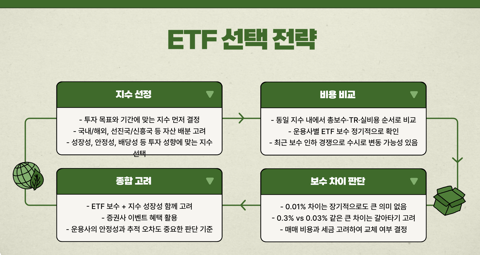 2025년 현재 ETF 보수는 과거와 달리 극단적으로 낮아졌습니다. 따라서 무조건 “가장 낮은 ETF만 고르자”라는 접근보다는,