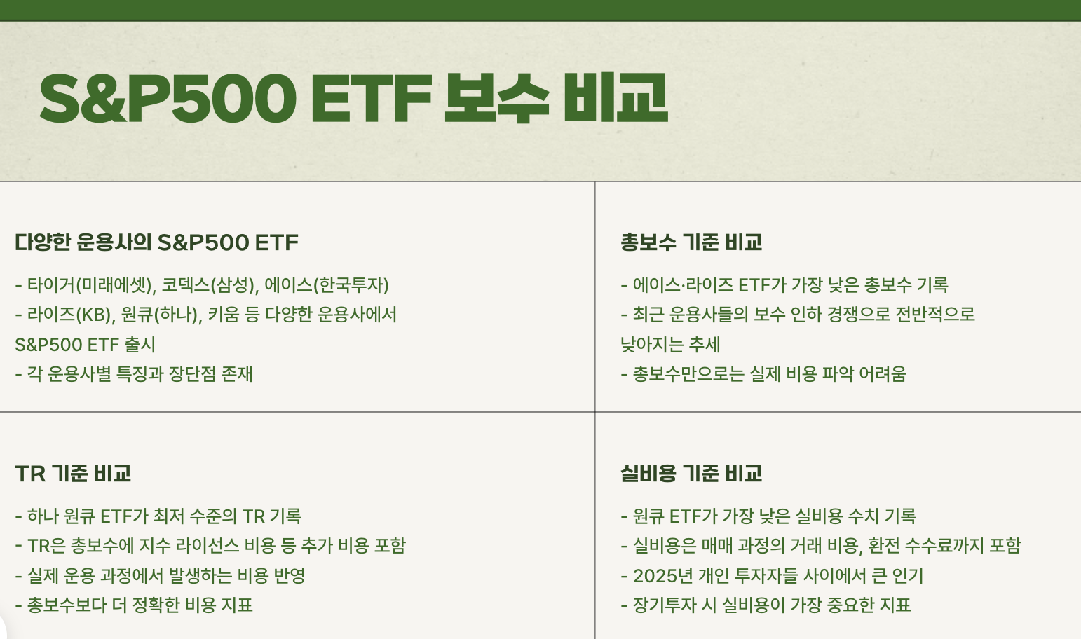 📌 결론: 장기투자라면 S&P500 원큐 ETF가 가장 저렴한 보수 구조를 제공하지만, 에이스·라이즈도 안정적인 대안이 될 수 있습니다.
