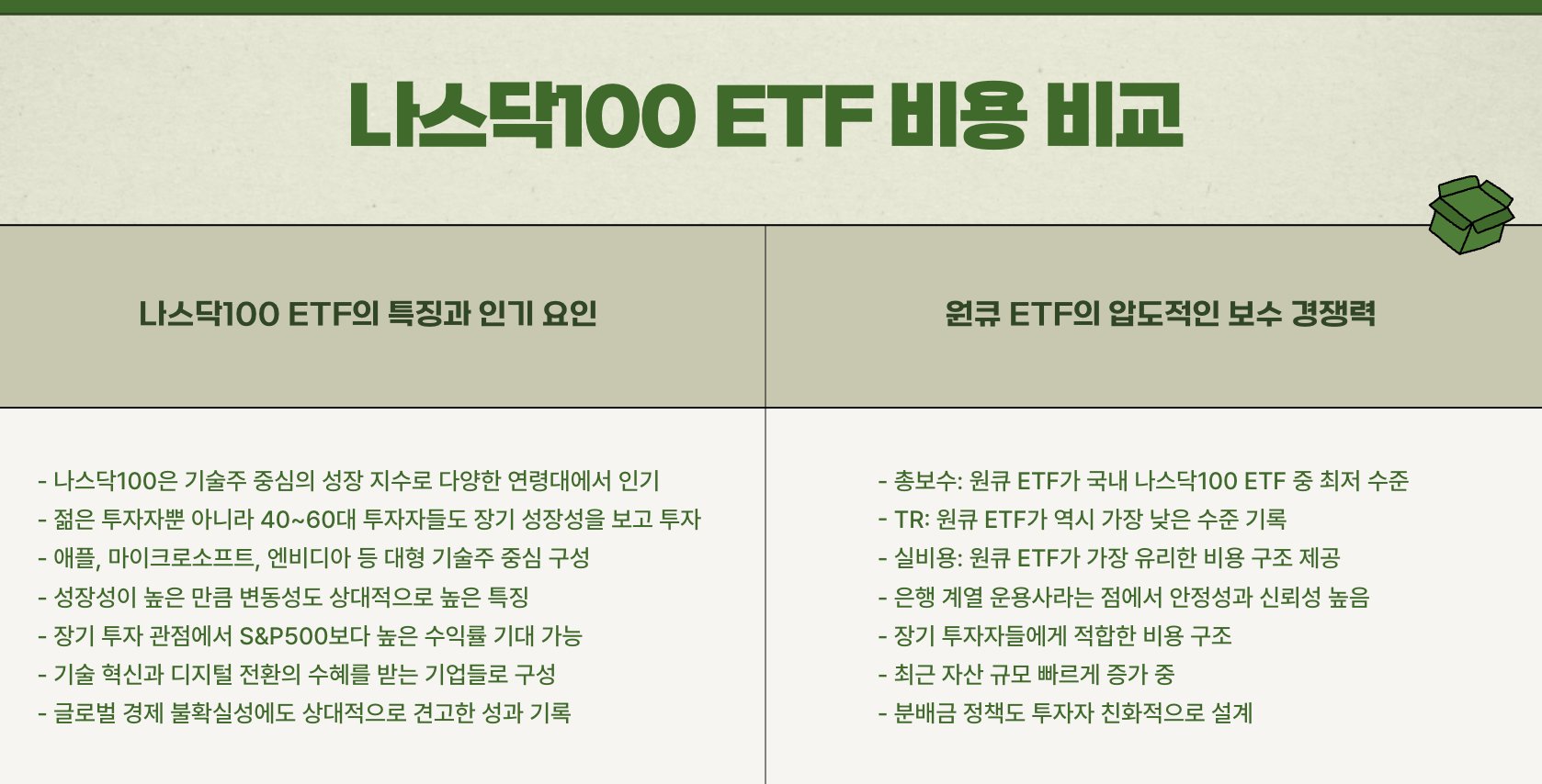 👉 즉, 나스닥100 ETF에서는 원큐 ETF가 압도적인 보수 경쟁력을 보이고 있습니다. 은행 계열 운용사라는 점에서 안정성과 신뢰성도 높아 장기 투자자들에게 적합합니다.
