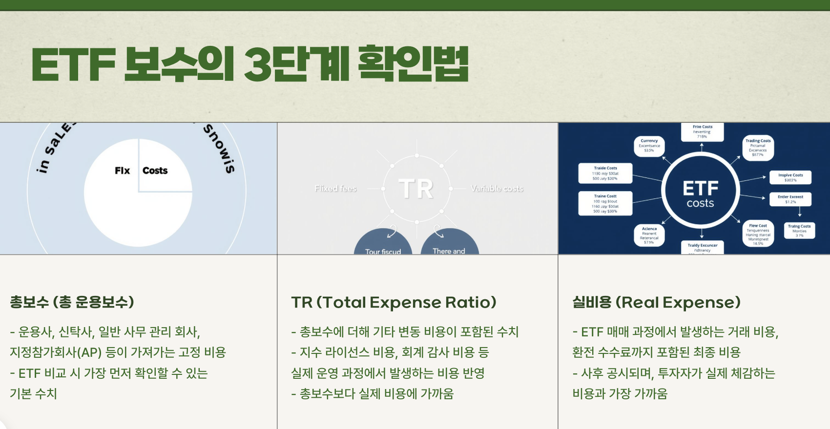 ETF 보수는 단순히 숫자 하나로 끝나지 않습니다. 실제로 투자자가 부담하는 비용을 계산하기 위해서는 3단계를 반드시 확인해야 합니다.