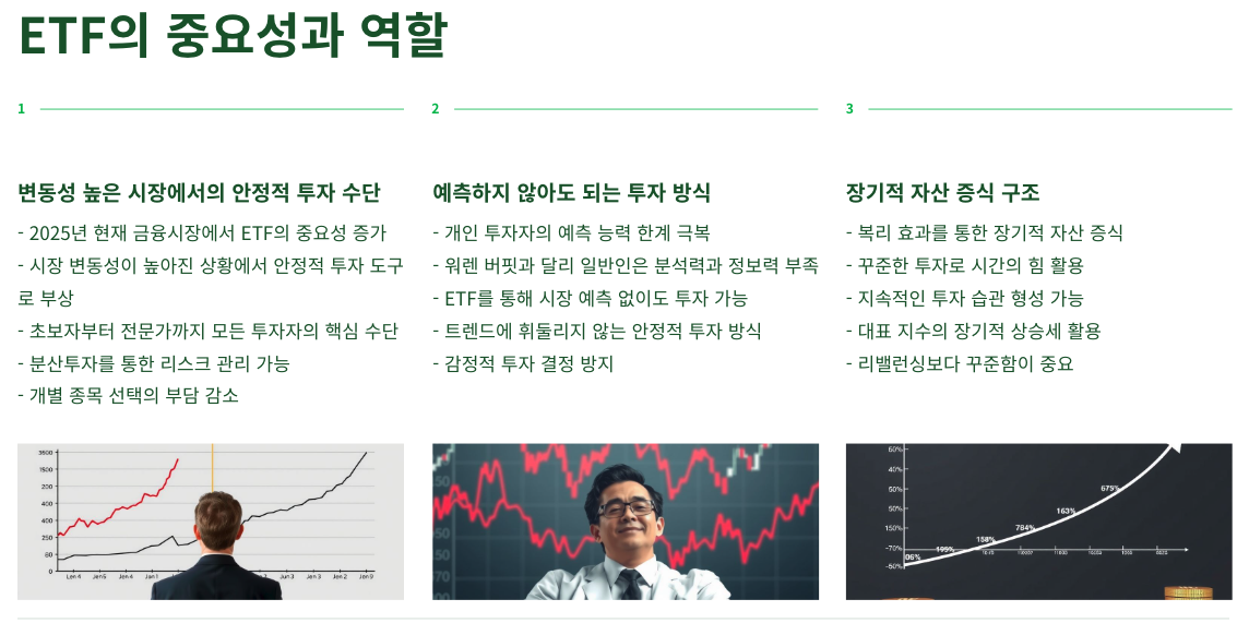 변동성이 높아진 시장에서 ETF는 예측하지 않아도 되는 투자 방식, 그리고 장기적으로 자산을 불려갈 수 있는 구조를 제공하며, 초보자부터 전문가까지 모든 투자자들의 핵심 수단으로 자리잡고 있습니다.